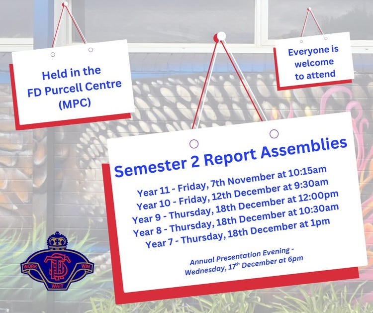 Semester 2 Report Assemblies are held for students in Years 7 to 11 with some awards also presented such as encouragement, citizenship, attendance, high academic achievement and academic excellence. Families are welcome to attend.